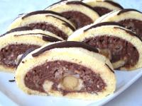 Unroll the base and ease the baking paper. Spread the filling over the roulade (leave the gap at the end forward to which the roulade will be rolled) and grate partially defrozen chestnut puree over the filling. From the marzipan create the small cylinder of around 1,5 cm diameter and place it on the edge from which the roulade will be rolled.