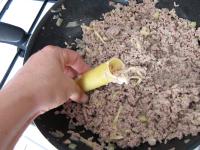 Simply with the fingers fill dry pasta tubes - Cannelloni with meat mixture. Hold the cannelloni in one hand so that fingers are closing an opening and with the other hand's fingers gently push the meat mixture in.