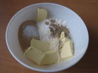 Put flour, baking soda, sugar, spices into the bowl and add the sliced soft butter.