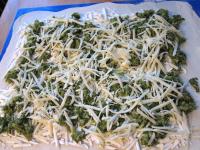 Roll out puff pastry and sprinkle with grated sheep cheese. Leave the edge to which the roll will be rolled clear about 8 cm wide.