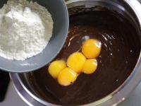 Add yolks to the chocolate. Add flour to the mixture. Finally, add the whipped egg white snow finely.