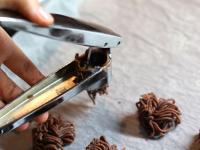 Take off small pieces of dough and push them through the garlic press in the baking tin with parchment paper. Form small balls.
