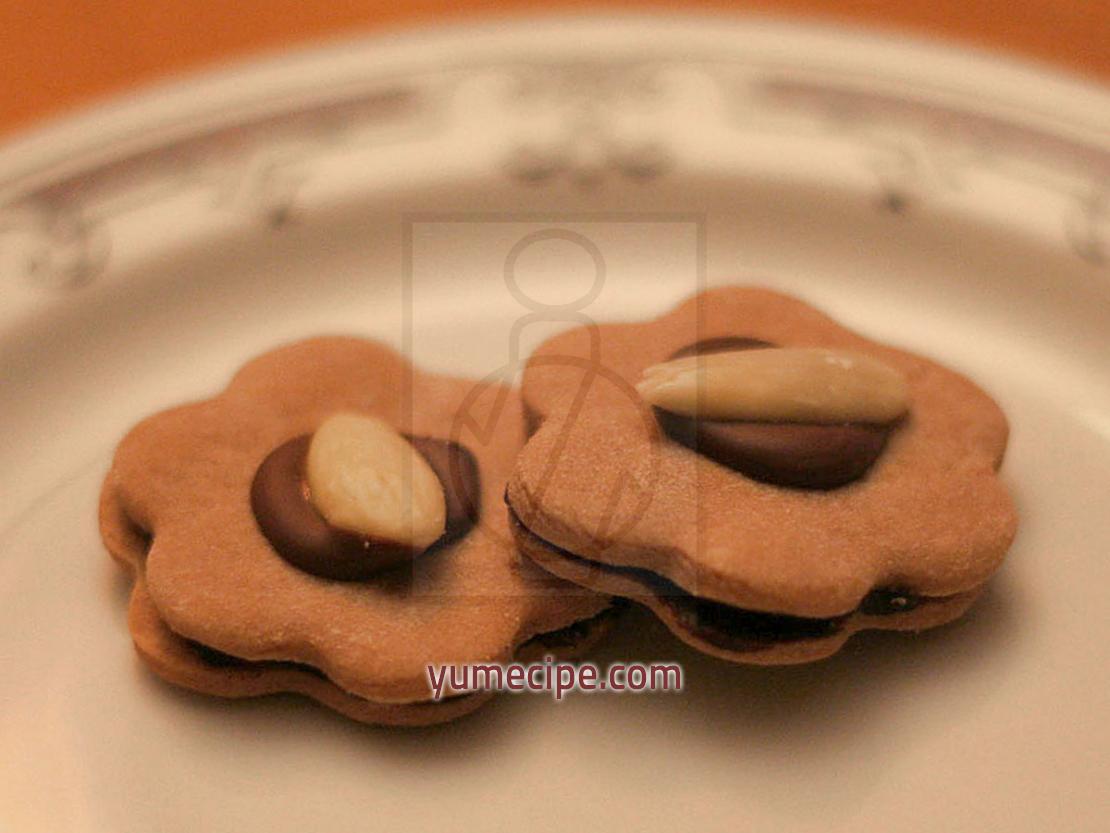 Pour the tablespoon of chocolate-coffee mixture on a half of chilled wheels and cover them with the remaining wheels. Decorate with topping and kernels of sweet almonds.