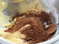 Mix cocoa powder in the remaining half of the dough, again pour in rum. Spread the dough over the first layer.