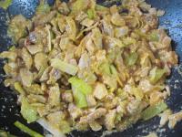 First, cut pork into thin slices and then into 3 cm long and 2 cm wide noodles.