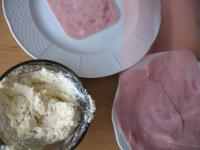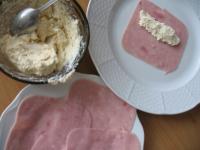 Fill six slices of ham with the prepared filling and roll it into a roll. Cook the eggs hard and, after cooling, cut them into wheels.