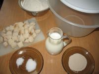 Pour warm milk into the kneading bowl, add sugar, salt, pour the flour, cubed bread roll and yeast. Knead all together properly. (If you use fresh yeast, it is suitable to prepare the starter first from warm milk, sugar and 1 tsp fine flour and then pour it into the flour and chopped bread roll)