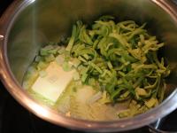 Melt butter in a pot over medium heat. Add leek chopped into half moon shape and cook for 5 minutes.