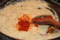 Cook flour in the hot oil, add ground red pepper and then pour cold water and milk to the roux.