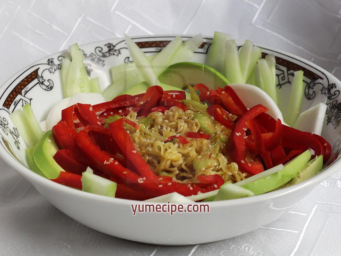 A recipe for a tasty spicy salad with raw vegetables and soft pasta in the Korean way.
