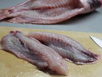 Cut the fillets off on both sides of fish. Proceed from the head to the caudal fin on the back bone side, first approximately centimeter deep cut. Then slowly and carefully cut off the meat around chest bones, always in the direction from the head.