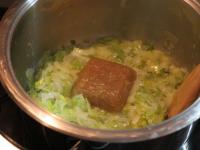 Melt butter in a pot over medium heat. Add leek chopped into half moon shape and cook for 5 minutes.