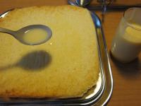 Remove paper and turn the pastry upside down on the plate. Sprinkle egg-nog on cake base.